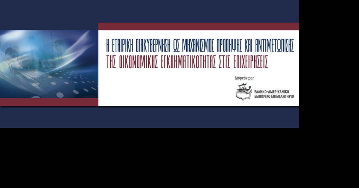 Το 4ο συνέδριο με θέμα «Η Εταιρική Διακυβέρνηση ως Μηχανισμός Πρόληψης και Αντιμετώπισης της Οικονομικής Εγκληματικότητας στις Επιχειρήσεις», διοργανώνει η Επιτροπή Εταιρικής Διακυβέρνησης του Ελληνο-Αμερικανικού Εμπορικού Επιμελητηρίου, την Τρίτη, 17 Φεβρουαρίου 2015 και ώρα 14.30, στο ξενοδοχείο Μεγάλη Βρετανία.