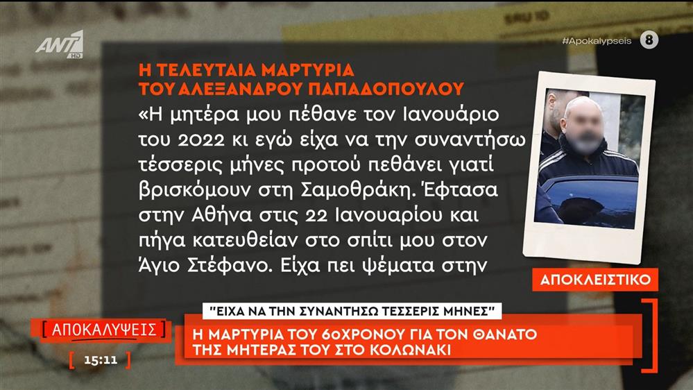 Η μαρτυρία του 60χρονου για τον θάνατο της μητέρας του στο Κολωνάκι